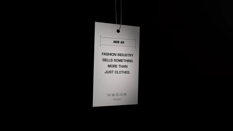 Clothing tag with size XS and text about fashion industry selling more than just clothes, hanging against a black background.
