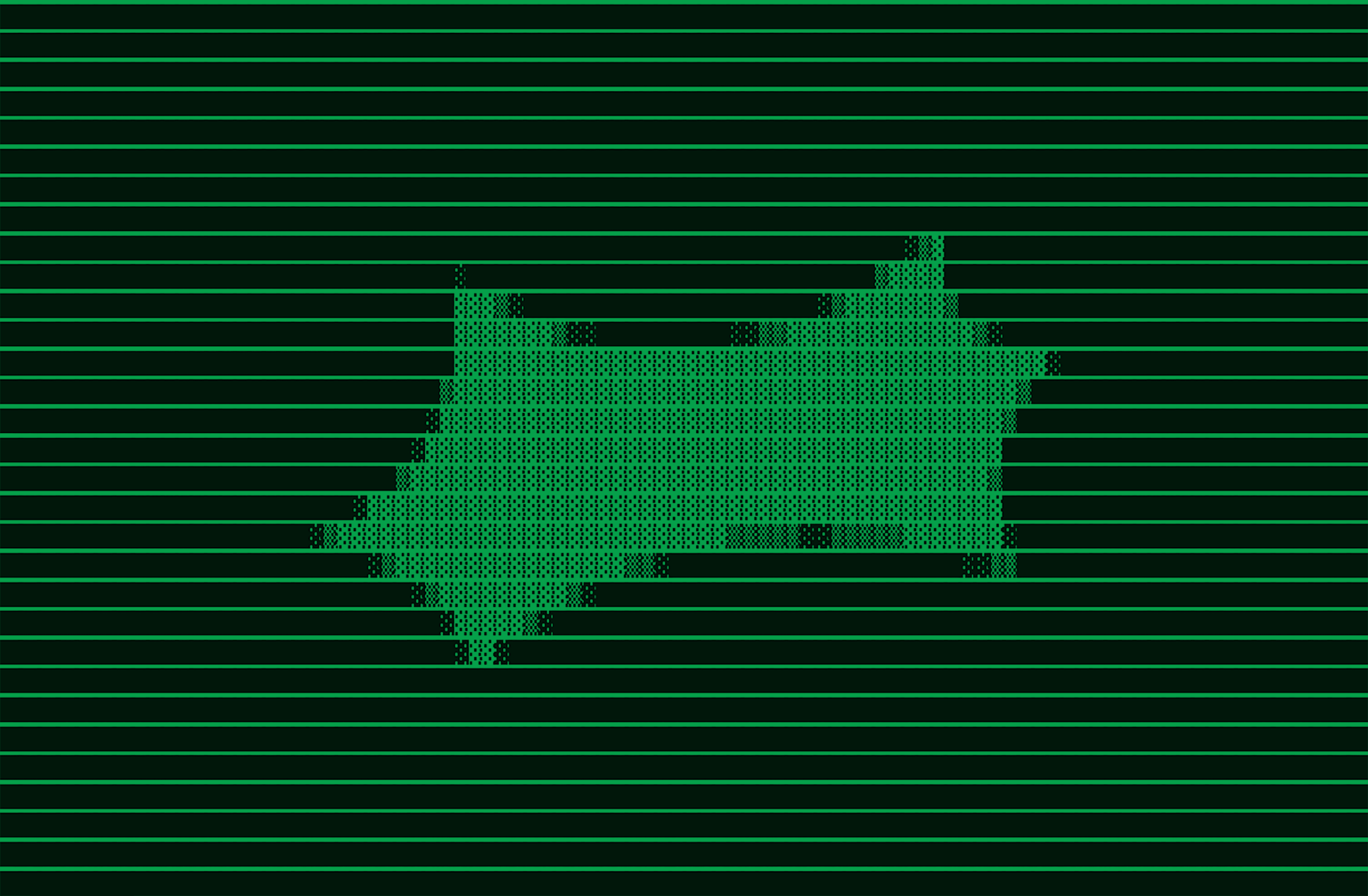 Green digital pixel art of a dinosaur on a striped green background