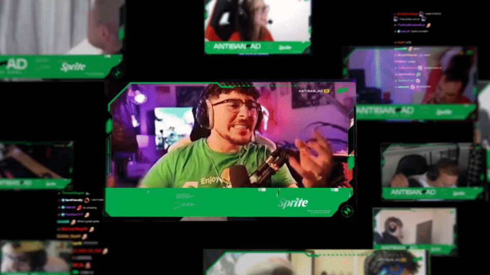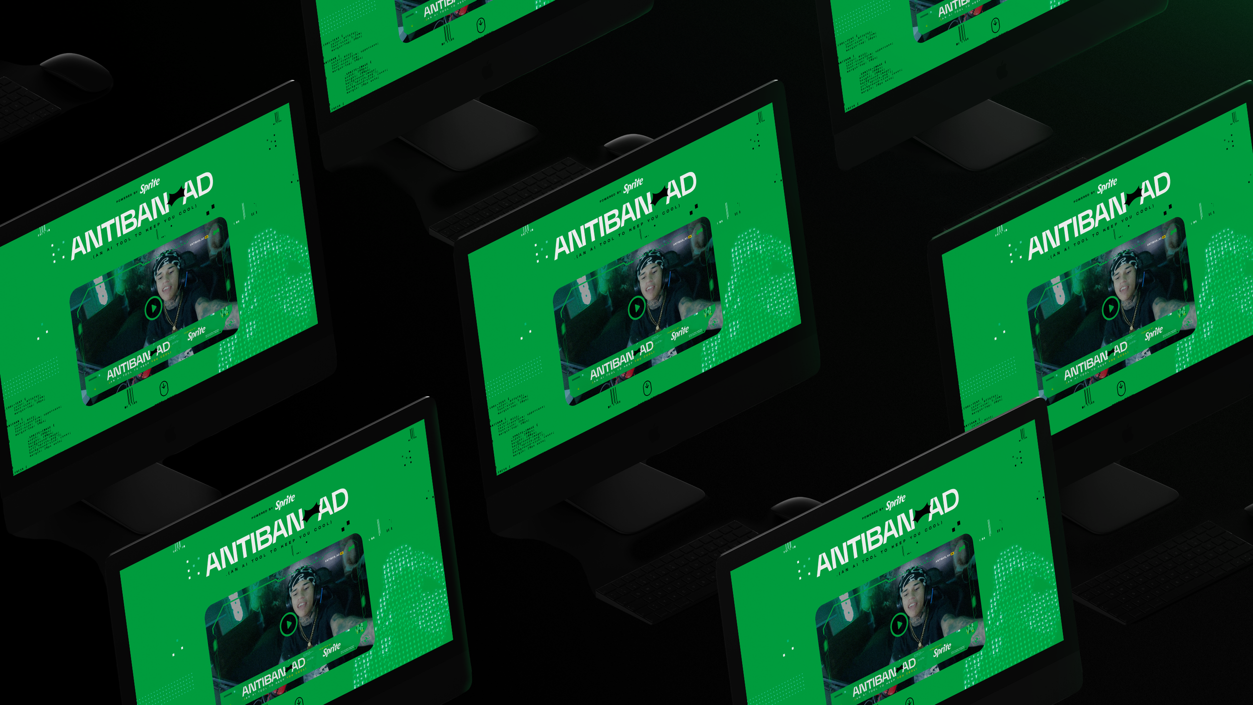Multiple computer monitors displaying a green advertisement for Sprite with the word "ANTIBANAD", featuring a video thumbnail of a woman talking with headphones on.