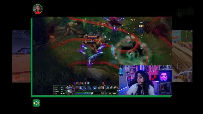 A woman with glasses streams herself playing a video game on her computer. The screen shows an online multiplayer game with characters battling, and her face is visible in a small webcam overlay at the bottom right corner, with a colorful background behind her.